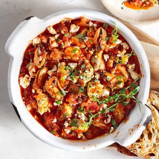 Μύδια σαγανάκι με φέτα και κόκκινη σάλτσα