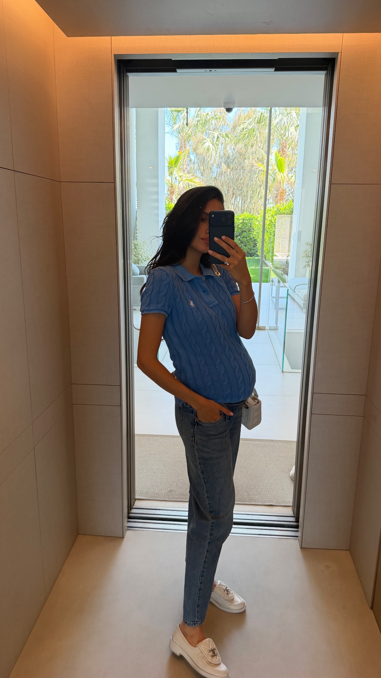Η εμφάνισή της είναι casual και προσεγμένη, καθώς έχει επιλέξει τζιν παντελόνι, μπλε μπλουζάκι και φλατ παπούτσια, συνδυάζοντας άνεση και απλότητα στην καθημερινότητά της.