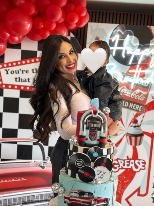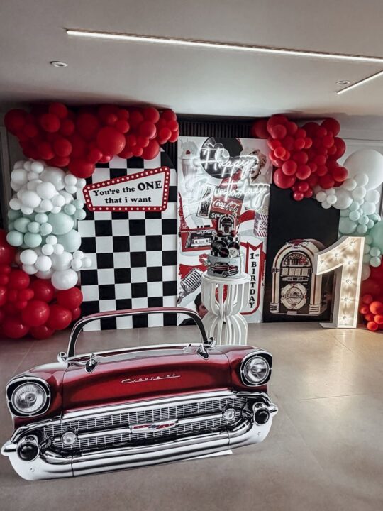 Το πάρτι ξεχώρισε για την ιδιαίτερη αισθητική του, με έντονες retro αναφορές που παρέπεμπαν στην iconic εποχή του “Grease”. Κόκκινα και λευκά μπαλόνια, καρό μοτίβα, vintage πινακίδες και εντυπωσιακά props δημιούργησαν ένα σκηνικό που έμοιαζε βγαλμένο από κινηματογραφικό set. Στο επίκεντρο βρέθηκε η πολυώροφη τούρτα, διακοσμημένη με στοιχεία όπως βινύλια, jukebox και κλασικά αυτοκίνητα, απογειώνοντας το concept της ημέρας.