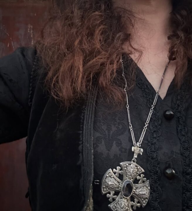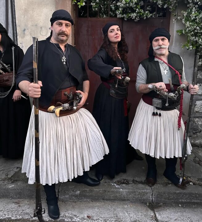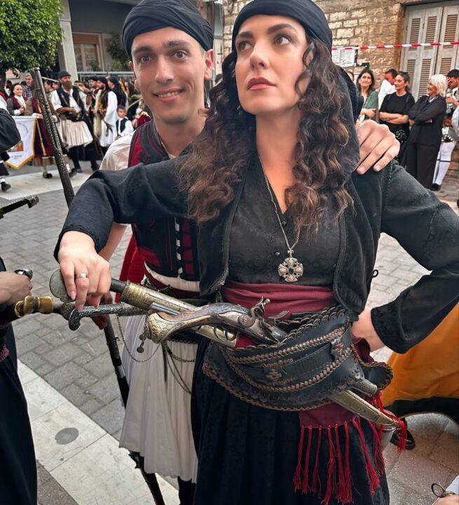Στις φωτογραφίες που μοιράστηκε στον προσωπικό της λογαριασμό στα social media, η Φωτεινή Δάρρα εμφανίζεται με παραδοσιακή φορεσιά από την περίοδο της Ελληνικής Επανάστασης. Το μαύρο σύνολο, το κεφαλομάντηλο και η χαρακτηριστική ζώνη με τα όπλα συνθέτουν μια εικόνα που παραπέμπει άμεσα σε ηρωίδα του ’21. Η επιλογή των στοιχείων δεν είναι τυχαία. Κάθε λεπτομέρεια, από τα κοσμήματα μέχρι το styling λειτουργεί ως κομμάτι μιας μεγαλύτερης αφήγησης, που συνδυάζει την ιστορία με τη σύγχρονη καλλιτεχνική ματιά. Στην πρώτη φωτογραφία ποζάρει με τον Νικο Αλιάγα τον διεθνώς αναγνωρισμένο έλληνα δημοσιογράφο που έχει αποδόσει φόρο τιμής στην πατρίδα του Ελλάδα με ποικίλους τρόπου και συγκεκριμένα στο Μεσολόγγι και στα Σταμνά από όπου κατάγεται.