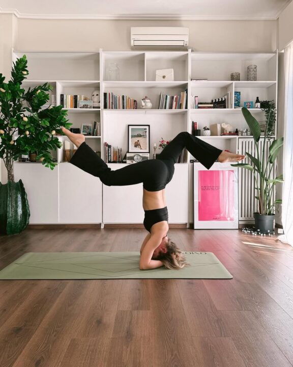 Αυτή η γήινη παλέτα των υλικών ολοκληρώνεται με το κλασικό, ζεστό παρκέ. Το ίδιο το πάτωμα λειτουργεί ως η βάση για την ιερή ζώνη της Κλέλιας, όπου μπορεί να κάνει γιόγκα με “φόντο” την εντυπωσιακή, custom-fit floor-to-ceiling λευκή βιβλιοθήκη που κυριαρχεί στον απέναντι τοίχο.