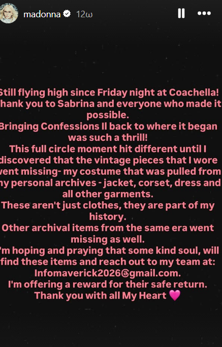 «Πετάω ακόμα ψηλά από την Παρασκευή το βράδυ στο Coachella! Ευχαριστώ τη Sabrina και όλους όσους το έκαναν δυνατό. Το να επαναφέρω το Confessions II εκεί που ξεκίνησε ήταν τόσο συναρπαστικό. Αυτή η στιγμή ήταν ξεχωριστή μέχρι που ανακάλυψα ότι τα vintage κομμάτια που φορούσα είχαν χαθεί – η στολή μου που ανέσυρα από το προσωπικό μου αρχείο – το σακάκι, ο κορσές, το φόρεμα και όλα τα άλλα ρούχα. Αυτά δεν είναι απλώς ρούχα, είναι μέρος της ιστορίας μου. Άλλα αρχειακά αντικείμενα από την ίδια εποχή χάθηκαν επίσης.