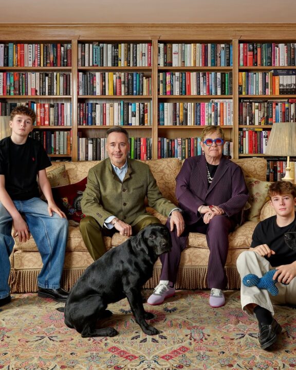 Ο θρύλος της μουσικής μαζί με τον σύζυγό του, Ντέιβιντ Φέρνις και τα δυο παιδιά τους, τον Ζάκαρι, 15 ετών, και Ελάιζα, 13 απαθανατίζονται στο σαλόνι του σπιτιού τους στο χωριό του Όλντ Ουίνδσορ, που βρίσκεται κοντά στο κάστρο που ανήκει στην βρετανική μοναρχία. Στη φωτογραφία μαζί τους ποζάρουν και τα δυο λαμπραντόρ της οικογένειας, ο Ζόζεφ και ο Τζέικομπ, ενώ και το κάδρο από μόνο του με την τεράστια βιβλιοθήκη και τα κλασικά έπιπλα, είναι άκρως εντυπωσιακό!