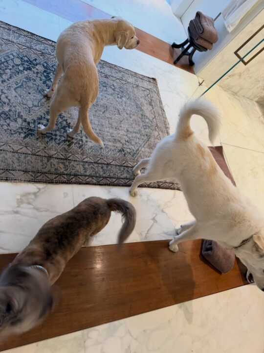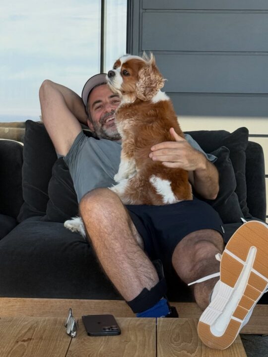 Στη νέα ανάρτηση της ηθοποιού, σε μία φωτογραφία φαίνεται να αγκαλιάζει τον σύντροφό της, ενώ σε άλλη ο Τζιμ χαλαρώνει στον καναπέ με ένα σκυλάκι στην αγκαλιά του.