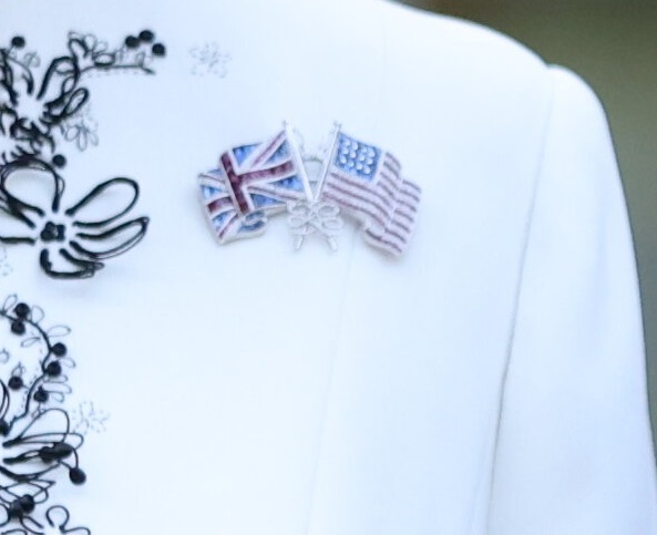 Το ενδιαφέρον των ειδικών του βασιλικού ρεπορτάζ μονοπώλησε το κόσμημα που επέλεξε να φορέσει η βασίλισσα Καμίλα. Πρόκειται για μια ιστορική καρφίτσα του οίκου Cartier, η οποία απεικονίζει τις σημαίες της Μεγάλης Βρετανίας και των ΗΠΑ ενωμένες.