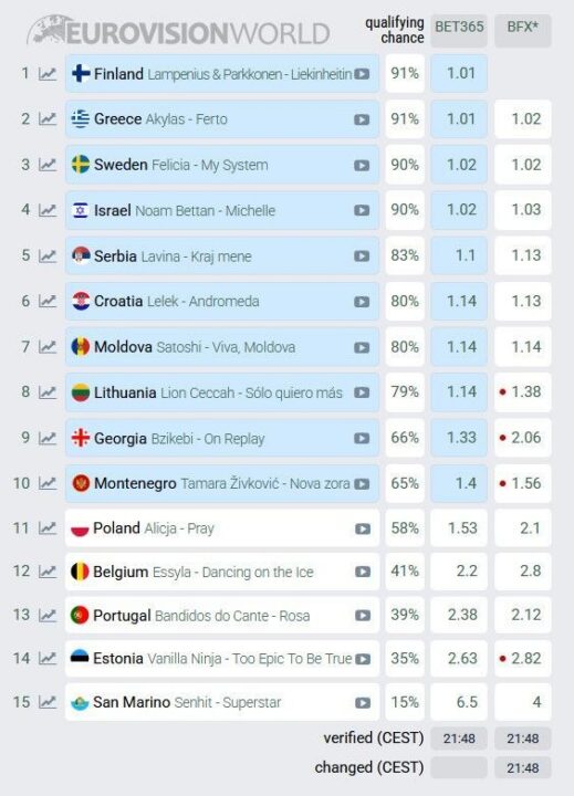 Στον πρώτο ημιτελικό όπως βλέπουμε στο eurovisionfun, η εικόνα είναι σχετικά ξεκάθαρη, καθώς οκτώ από τα δέκα εισιτήρια φαίνεται να έχουν σχεδόν «κλειδώσει». Η Φινλανδία, η Ελλάδα, η Σουηδία και το Ισραήλ θεωρούνται σχεδόν σίγουρες για πρόκριση. Αμέσως μετά ακολουθούν η Σερβία, η Κροατία, η Μολδαβία και η Λιθουανία, οι οποίες συγκεντρώνουν επίσης πολύ υψηλές πιθανότητες πρόκρισης.