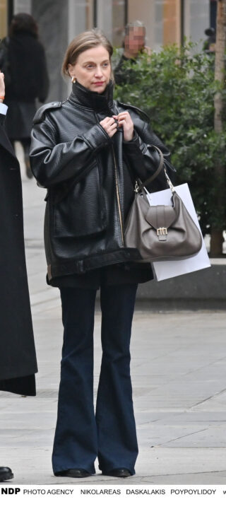 Η Λένα Δροσάκη πραγματοποίησε μία ακόμη κομψή και προσεγμένη εμφάνιση στην πόλη, επιλέγοντας ένα σύνολο που ισορροπούσε ιδανικά ανάμεσα στη διαχρονική κομψότητα και τη ρετρό αισθητική. Αν και το βλέμμα αρχικά τραβούσε το μαύρο δερμάτινο jacket με επένδυση shearling – η επιλογή αυτή δεν ήταν τυχαία. Τα ανοιξιάτικα βράδια, που συχνά διατηρούν μια απρόβλεπτη ψύχρα, επιτρέπουν τέτοιες στιλιστικές «επιστροφές» σε πιο ζεστά outerwear, δίνοντας μάλιστα την ευκαιρία για πιο ενδιαφέρον layering και fashion statements.