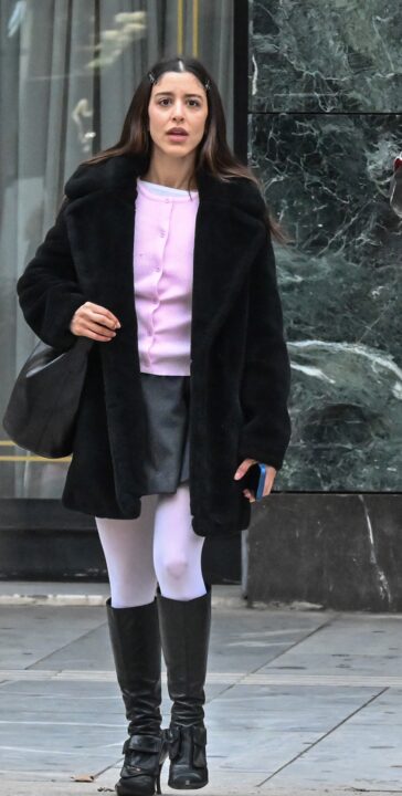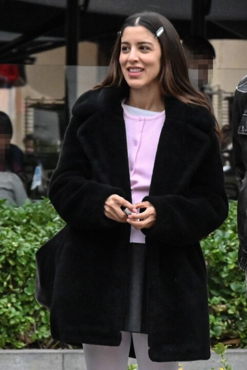 Με ένα cozy αλλά ταυτόχρονα ultra stylish σύνολο, η αγαπημένη καλλιτέχνιδα επέλεξε ένα μαύρο γούνινο παλτό με έντονη υφή, η οποία αγκάλιαζε χαλαρά τη σιλουέτα της, χαρίζοντας μια αίσθηση ανεπιτήδευτης κομψότητας. Από μέσα, ένα απαλό ροζ top έδινε τη δική του ρομαντική νότα, δημιουργώντας την τέλεια αντίθεση με το total black outerwear.