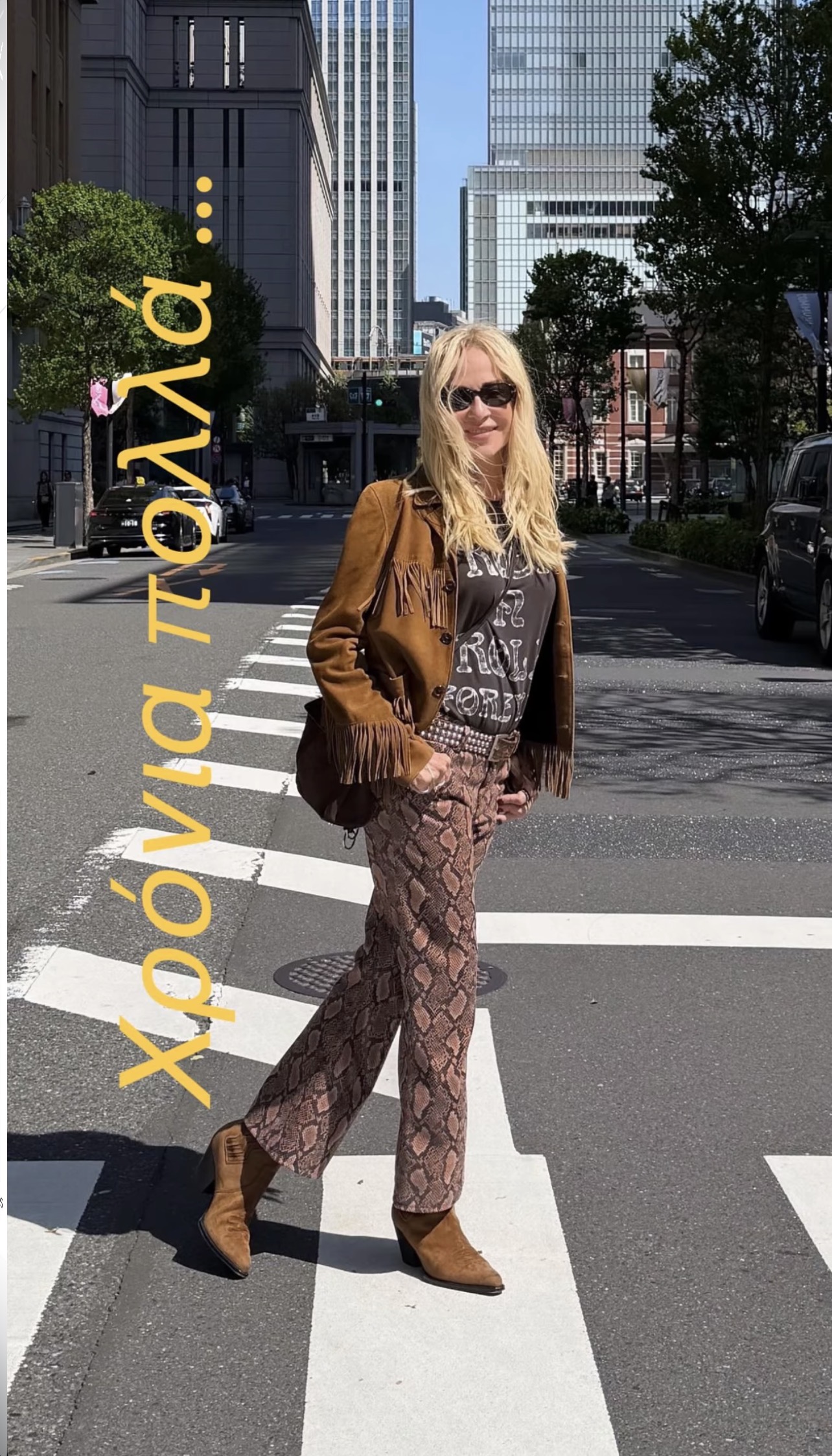 Οι Λεπτομέρειες που Κάνουν τη Διαφορά: Το look ολοκληρώνεται με ένα graphic T-shirt που “ηρεμεί” το σύνολο, μια εντυπωσιακή ζώνη με τρουκς και τις κλασικές ταμπά suede μπότες.